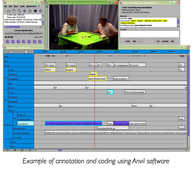 Considerable discussion has been devoted to the ways in which AAC devices are employed during conversational interactions and the role of gesture and partner co-construction in the formulation of messages. These issues are central to the understanding and measurement of communication performance and the utility of newly emerging automated data logging technologies. In order to address these issues, we analyzed the real-time interactions of participants using the Anvil digital annotation and coding system (http://www.anvil-software.de). Using videos taken from the previous study, 12-minute segments of interaction were analyzed Communicative signals (speech, gesture, device use) were transcribed and coded for their role in the interaction. We developed a coding taxonomy based on the work of Herbert Clark (Clark and Brennen, 19991; 1996) to capture the communicative contributions of each individual and their role in grounding meaning. (download coding manual here)