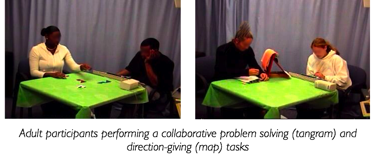 Preliminary analysis of our data suggests the differing use of symbolic gestures (emblems, pointing, illustrators) and partner co-construction across the various communication tasks.