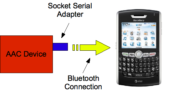 Many of the AAC systems currently in use today have the ability to send keystrokes and mouse commands to devices that support the SerialKeys protocol. We've written a version of a serialkeys interpreter for the Blackverry handhelds. The AAC device sends GIEDI formatted commandes to the serial port. The Socket Serial Adapter is connected to the AAC device's serial port. The Serial Adapter converts the incoming information to Bluetooth wireless. The Blackberry uses Bluetooth to receive the incoming commands, which the SerialKeys emulator converts to keystrokes and button commands.