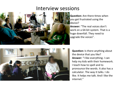 Because of a number of factors (small size of consumer base, health and physical condition, travel, variability in communication performance, etc.), it is difficult to locate and enroll AAC users to as technology testers and/or consultants. For these reasons, the AAC field typically engages consumers in two ways: sometimes as focus group participants, and/or as short term testers at the end of the development process. Focus group results are limited in that they fail to provide coherent portrayals of user practices. By the time that a device is ready to be tested, the design is set in stone and significant changes cannot be made. By not actively engaging consumers throughout the design process, critical design decisions which are often made early on, are made without their valuable input!